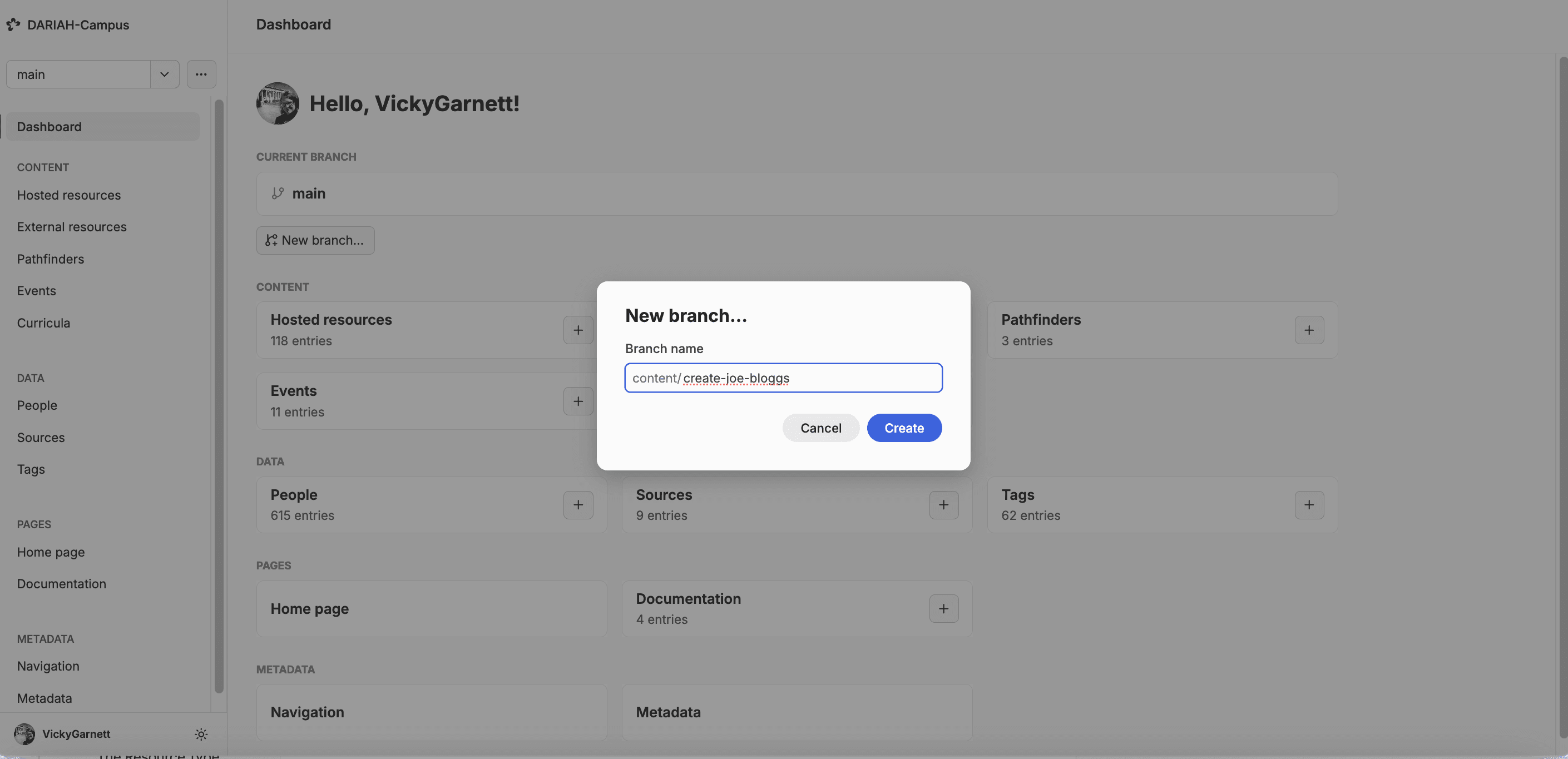 First things first, you need to start a new branch for your new resource. As has been shown in earlier sections, you can do this by first making sure you are on the ‘Main’ Branch, and then clicking the ‘Create New Branch’ button. You will be presented with a pop-up window where you can add your branch name, remembering to replace spaces with hyphens.