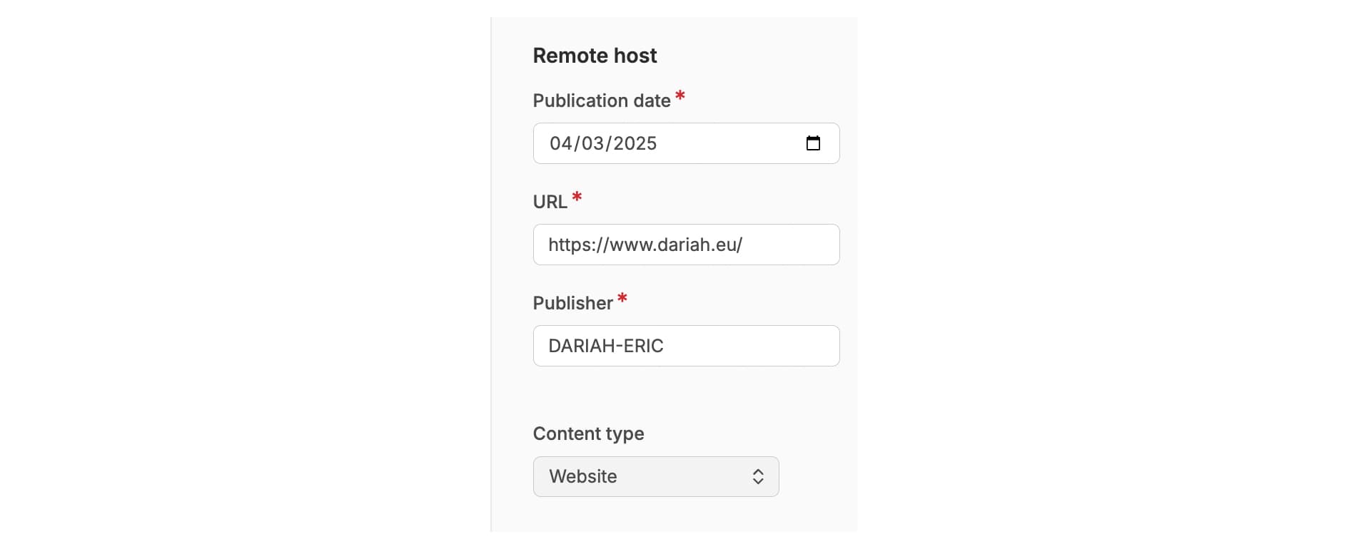 In the last section of the metadata, we have the ‘Remote Host’ data. This is what distinguishes an External Resource from a Hosted Resource, as this section of the metadata covers the information from the original publishing platform. All this information is used as part of the citation that is generated by DARIAH-Campus for your resource.