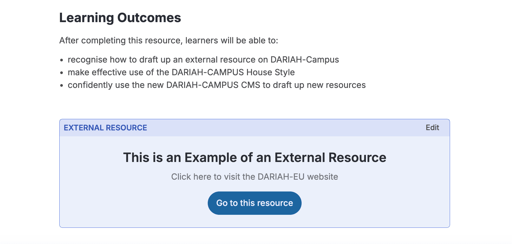 In addition, you are also required to provide learning outcomes that learners can reasonably expect to have once they have completed the resource. Learning Outcomes should sit beneath the description of the resource, and before the ‘External Resource’ widget is added.