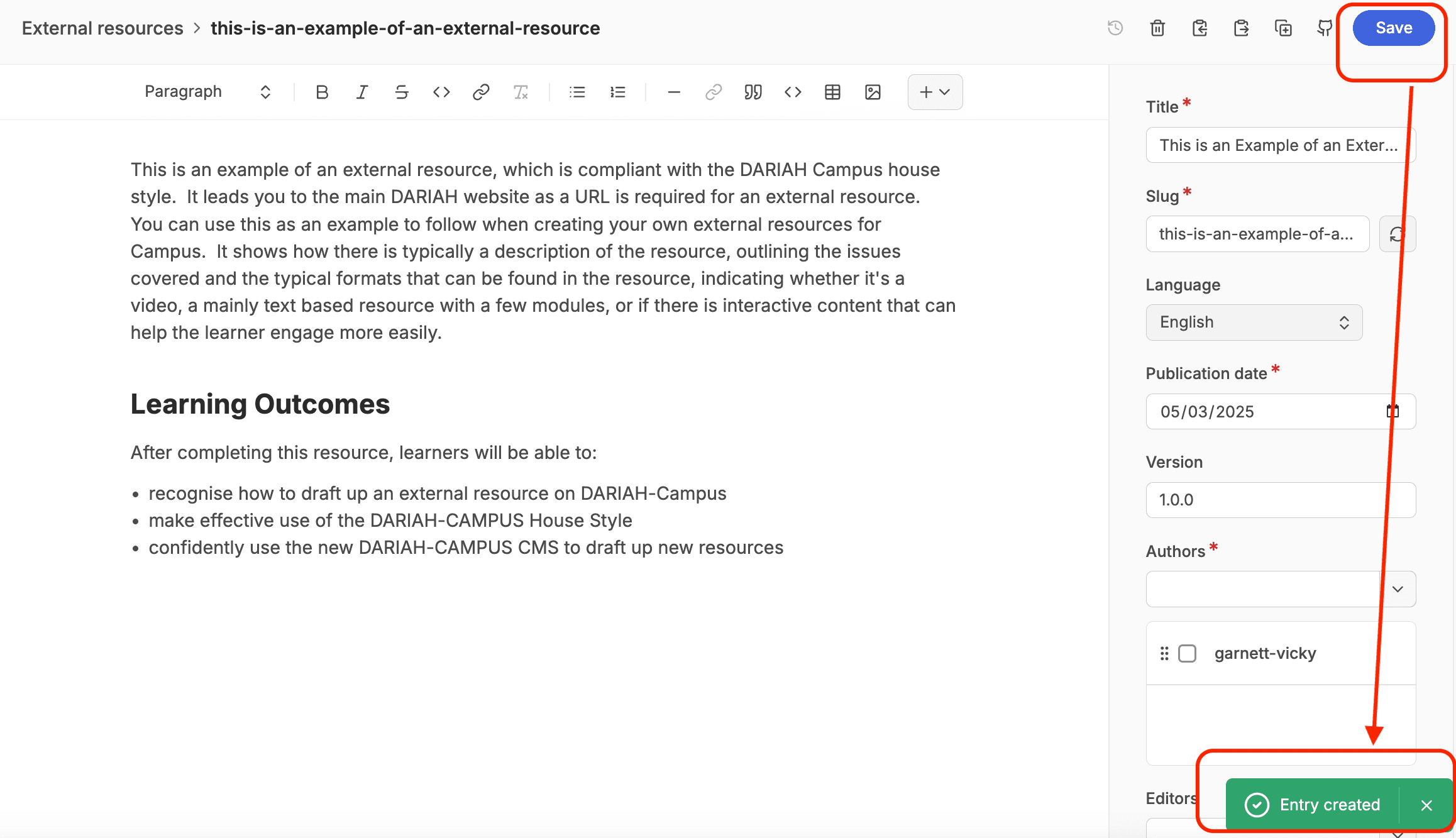 This completes all the metadata fields for a hosted resource, and at this point you can now ‘Create’ your initial draft by clicking on the blue button in the top right-hand corner of the screen. This will save all the metadata. Once you have created the draft, the blue button will change to say ‘Save’. We recommend that you save your work frequently to avoid any loss of content.