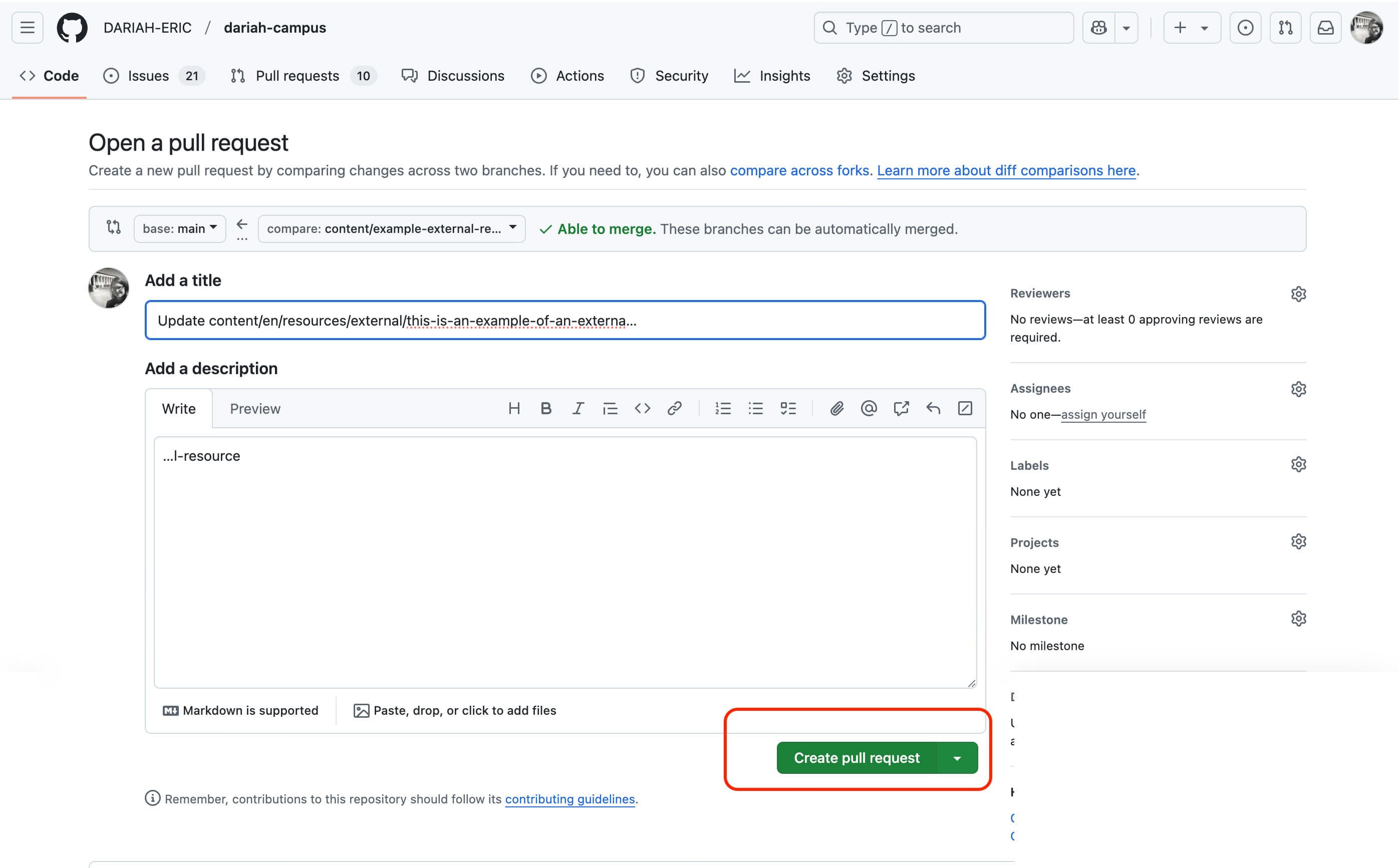 At this point, you may wish to ‘Create’ a pull request, and save your work. You can of course do this at any point in the editing process once the required metadata has been entered. In the case shown in the figure below, this was done before adding the ‘External Resource’ widget. When you choose to create the pull request and save your work is up to you, depending on your own practices, although we recommend saving frequently after a set of changes to ensure nothing is lost in the unlikely event of a website crash, or if you have to step away from your computer.