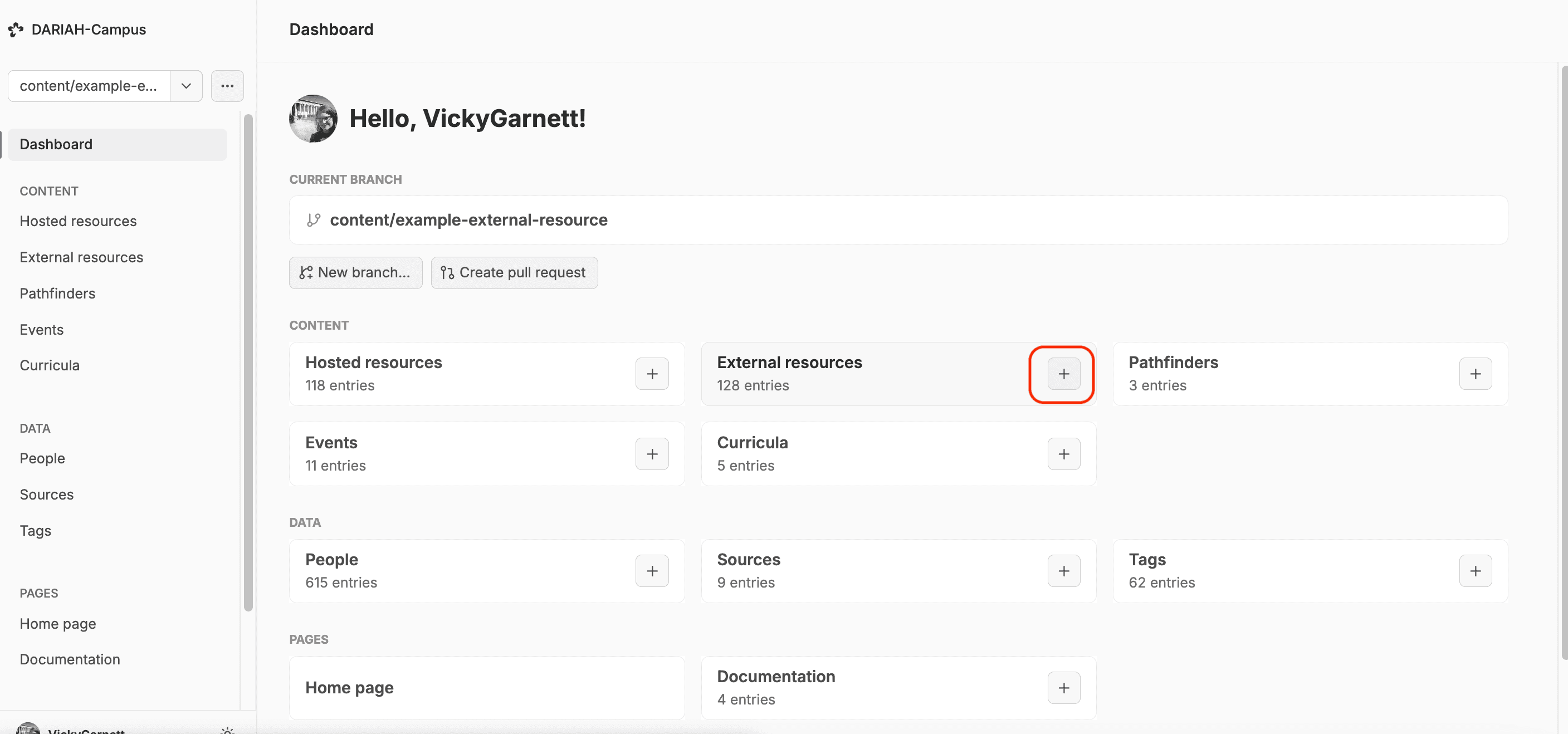 In all cases when adding a new resource, or adding a new person, you want to create a new ‘branch’. To do this, first go to the dashboard.
