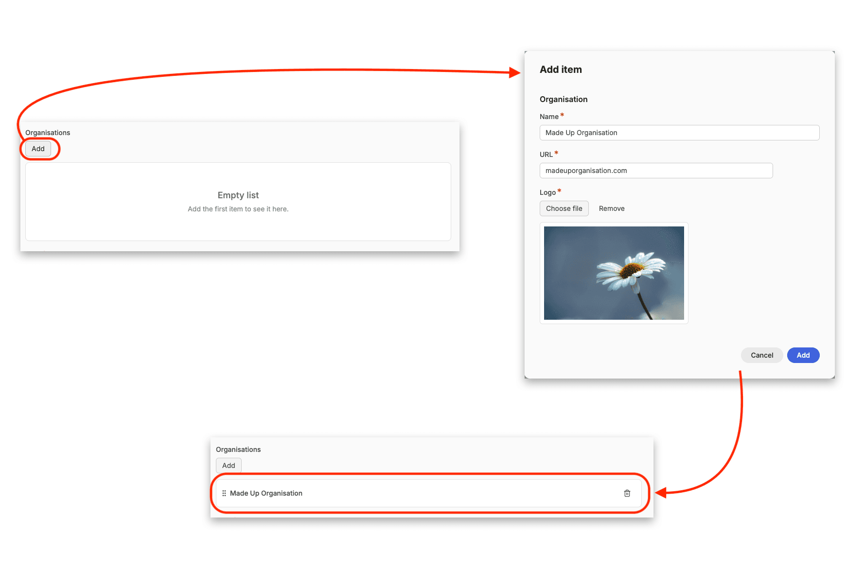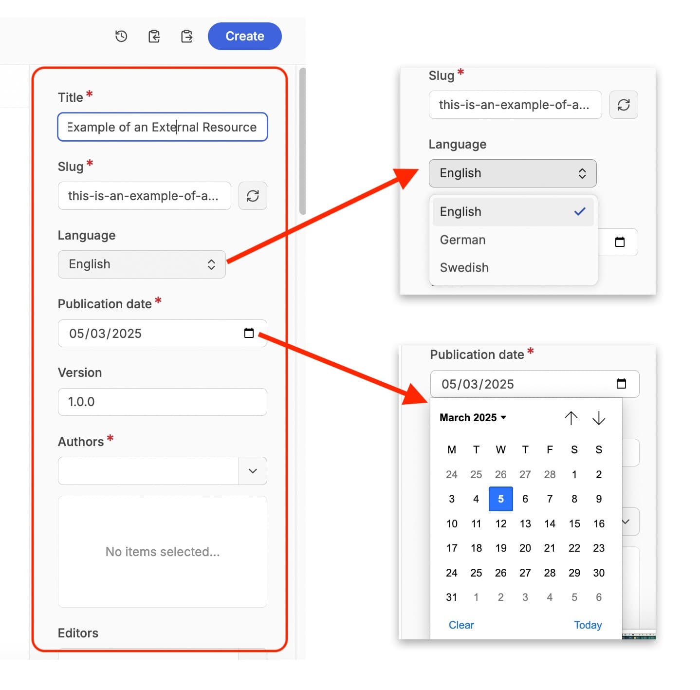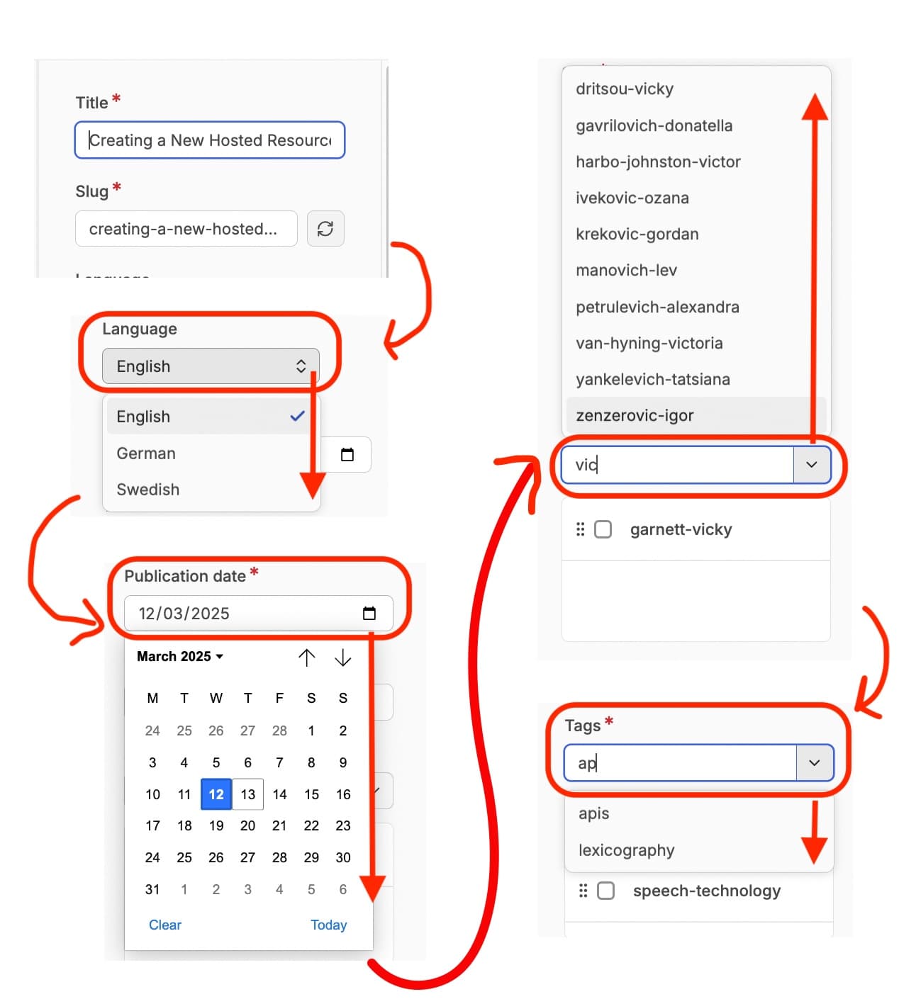The first field is the title of the resource. This in turn generates the ‘slug’ for the url of the resource, based on the title.