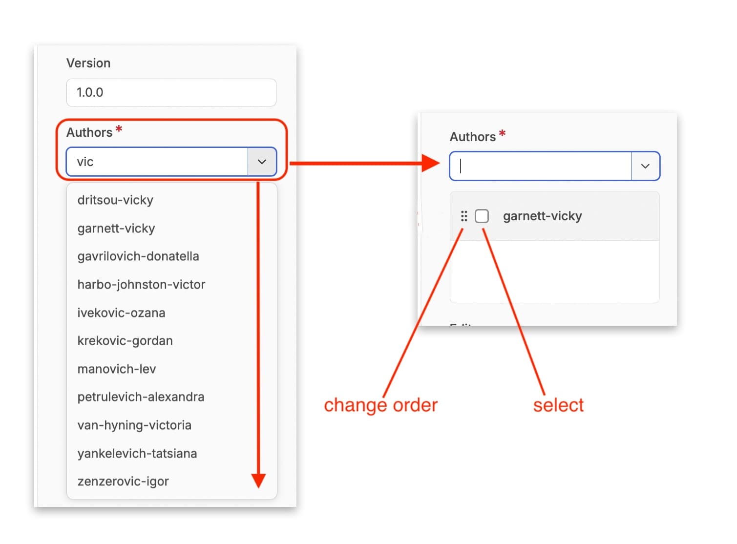 Once you have selected an author or authors, it will appear in a box below the drop down menu. For each person there is the option to change the order of authors listing, indicated by an icon featuring six dots, or the option to select that author, indicated by a checkbox, so that you can remove them from the list if required.