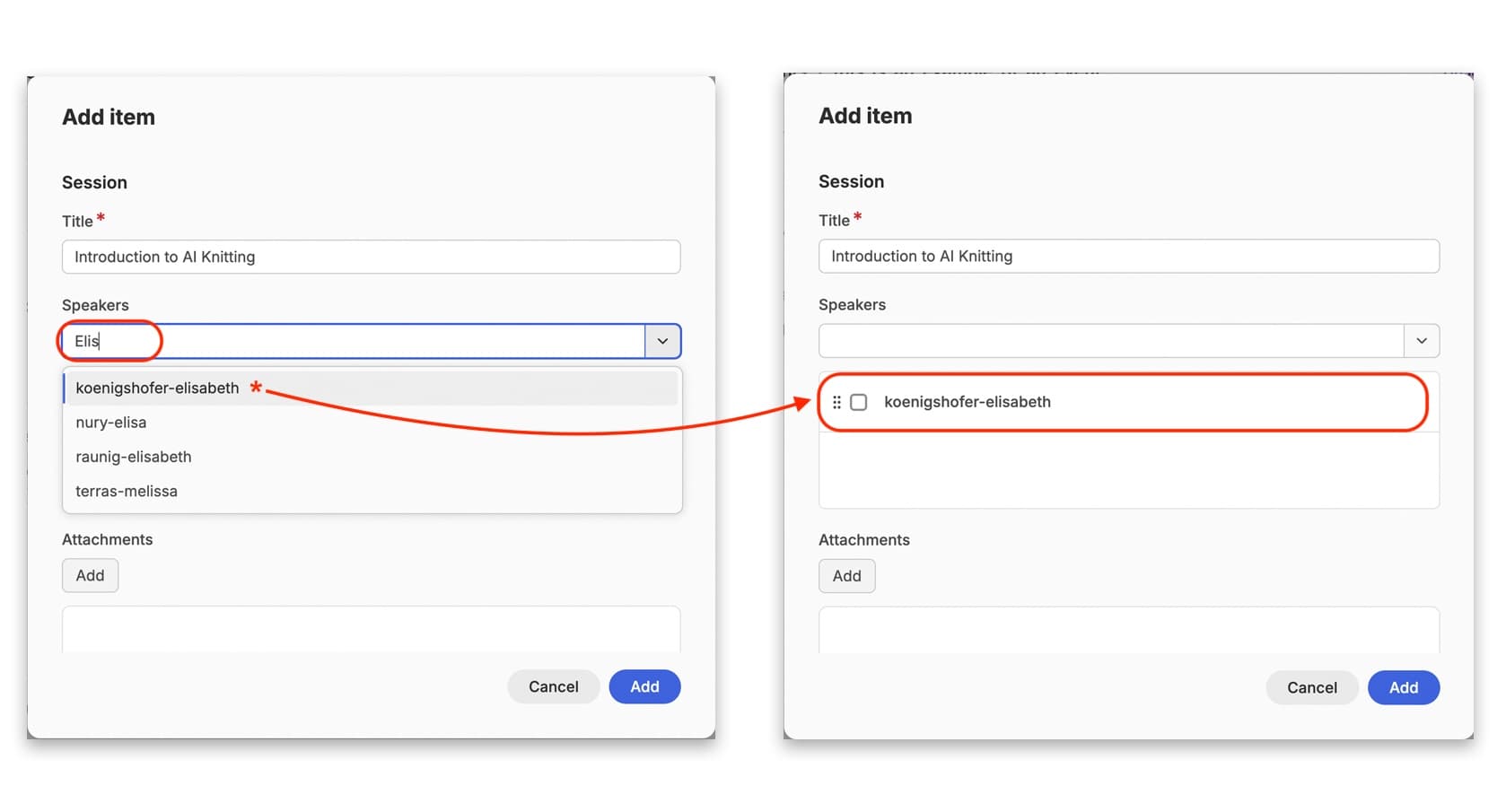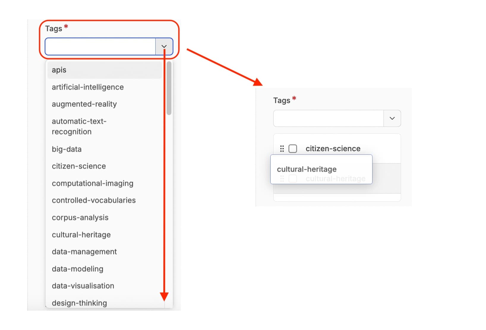 Tags are selected in the same way as authors. You can use the search field next to the drop down button to start typing a topic, and select an appropriate tag from or tags from there. You can also re-order these by clicking on the 6 dots and dragging the tag up or down the list.