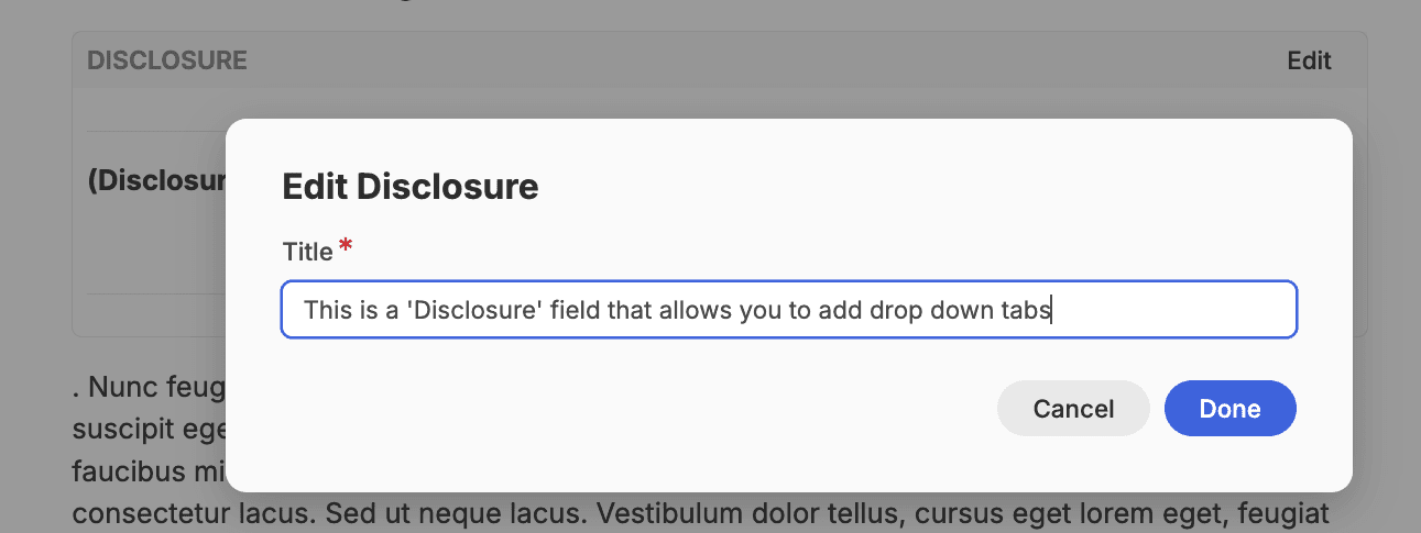 When you click on the disclosure widget option, an editable version will appear. Click on the ‘edit’ button to open a pop-up window that asks you to give it a title.