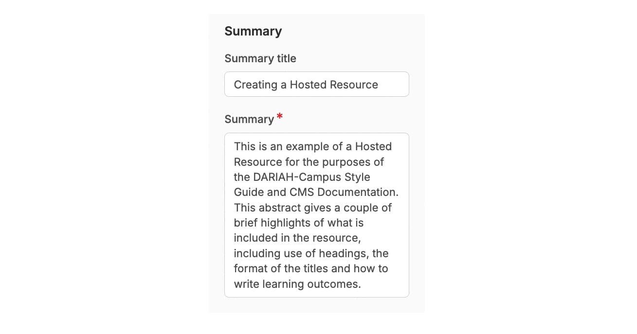 The Summary (formerly known as the ‘Abstract’) is the information that is displayed on the main ‘Resources’ page of DARIAH-Campus and offers a short preview into what the resource is about to entice the learner. The summary should be no longer than 80 words, and should describe what is covered in the resource.