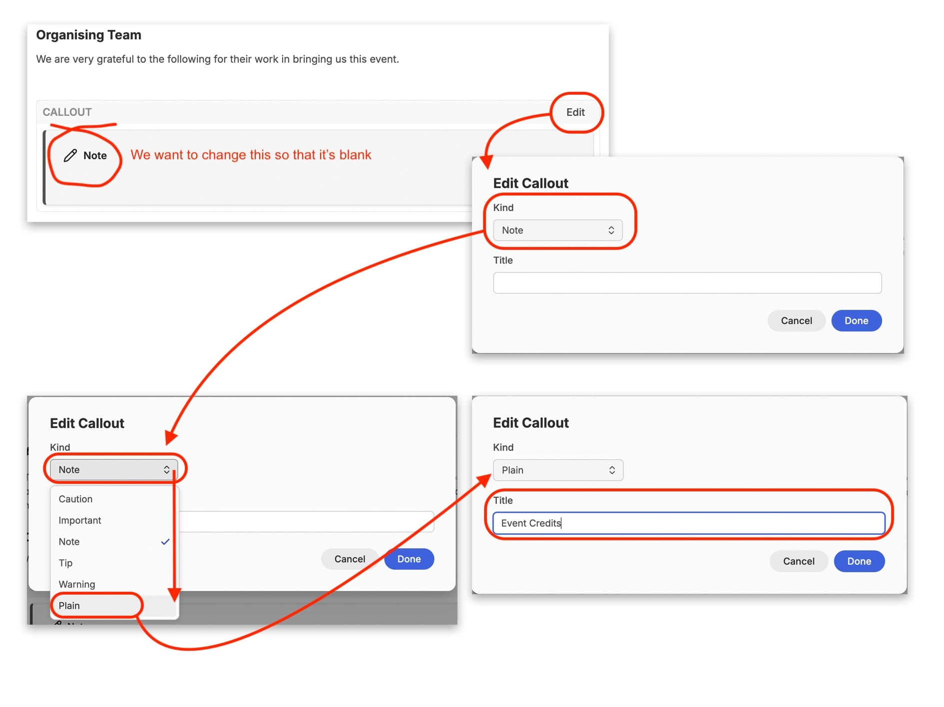 When you first click on this option, a blank ‘Note’ box will appear where you had your cursor. At the same time, a ‘pop-up’ will appear allowing you to edit this. You can choose from different types of call out, and this will determine the colour of the box when it appears in the resource. You can also edit the title of the note, leaving it as its default, or changing it to something more specific to your content.