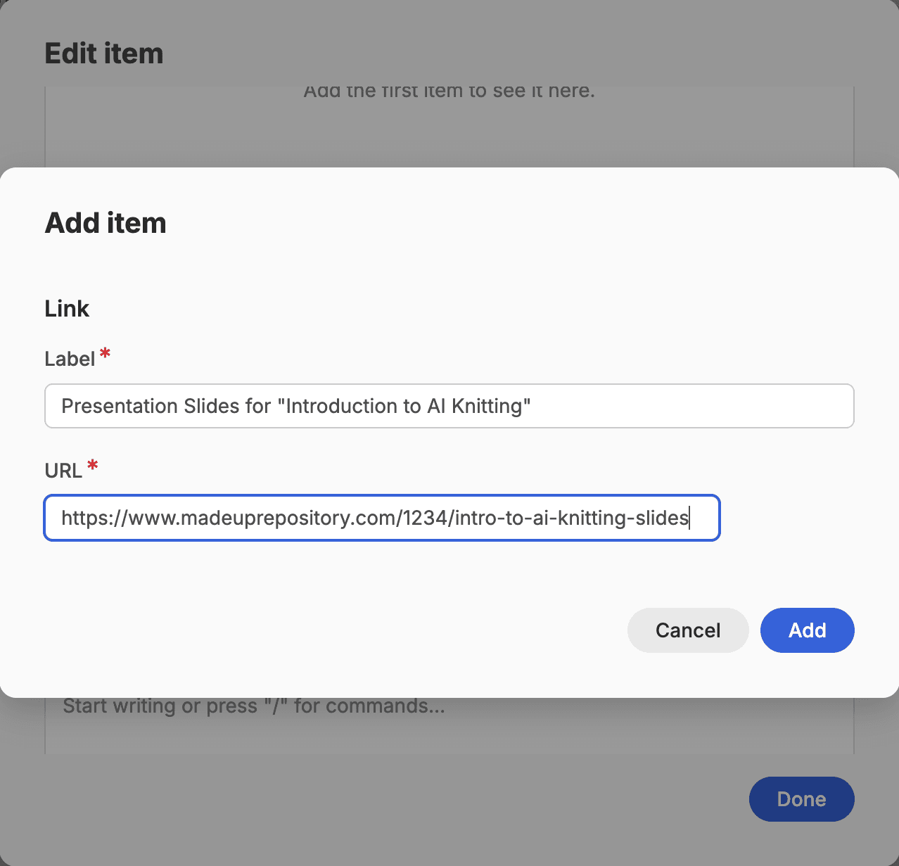 A placeholder box for an External Resource will appear in the workspace. Click on the ‘Edit’ button, and a pop-up window will appear asking you for additional required information. In the ‘Title’ field, you can enter the resource title. You can shorten this to the ‘Summary title’ you may have used in the metadata if the full title is really long.