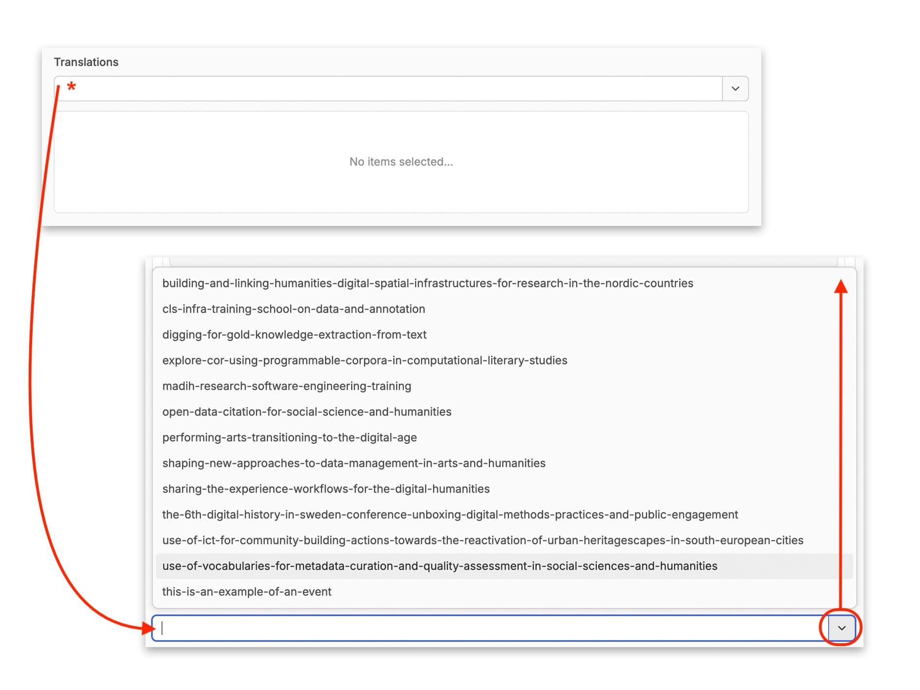Sources are also selected in the same way. The ‘Source’ is used to assign a ‘channel’. In most cases, the source is ‘DARIAH’, unless you already have a dedicated ‘channel’ in place as agreed with the DARIAH-Campus Editorial Board.