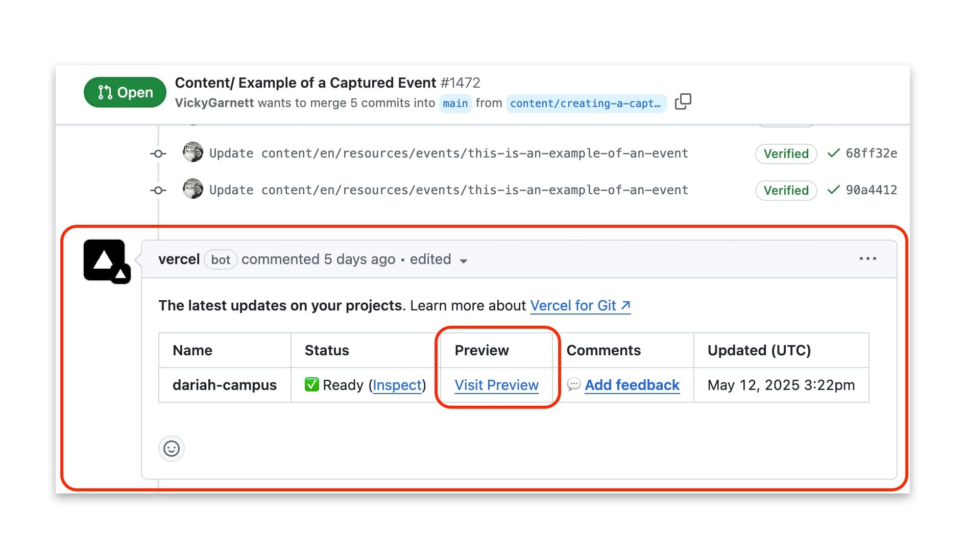 The screen will now change to show you the actual pull request that your draft is filed in on GitHub. After a short while, a ‘Vercel bot’ will post an automatic message to the Pull Request which includes a table showing a summary of the latest updates. In this table you will see a link to ‘Visit Preview’.