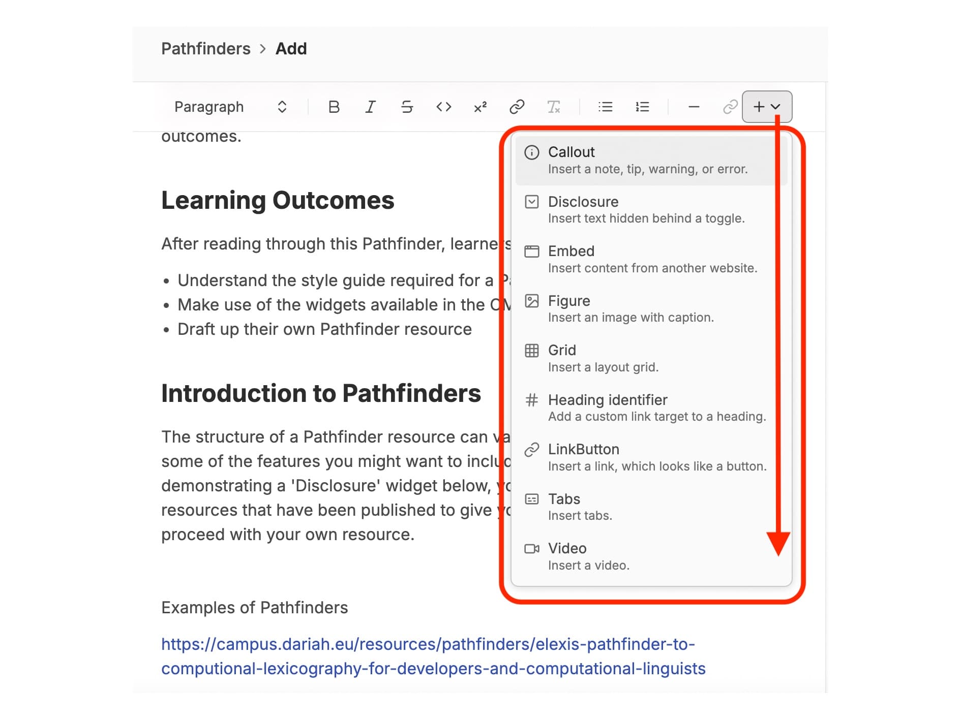Below the ‘Learning Outcomes’ you should now add the ‘External Resource’ widget. All the widgets for resources can be found by clicking on the dropdown menu indicated with a plus sign on the end right of the formatting options. From this dropdown menu, select the ‘External Resource’ option.