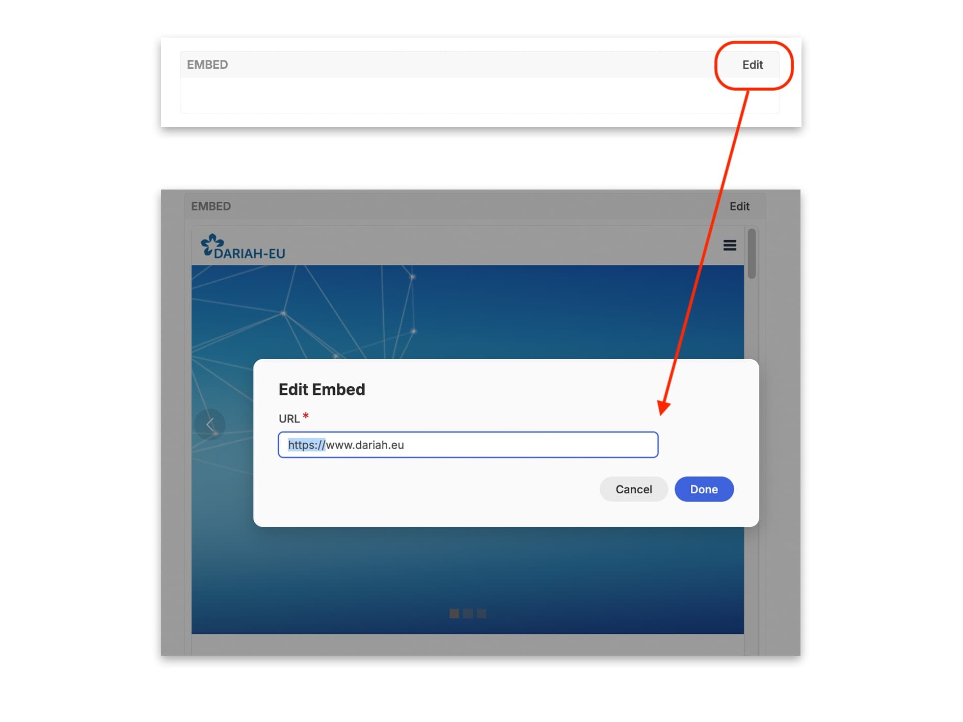 Select the ‘Embed’ option from the widget dropdown menu. When you do this, a blank box with an ‘Edit’ button in the right hand corner will appear. Click on this, and a pop-up window will appear for you to type in the full URL (don’t forget the ‘https://www’ bit!) for the webpage you want to embed.