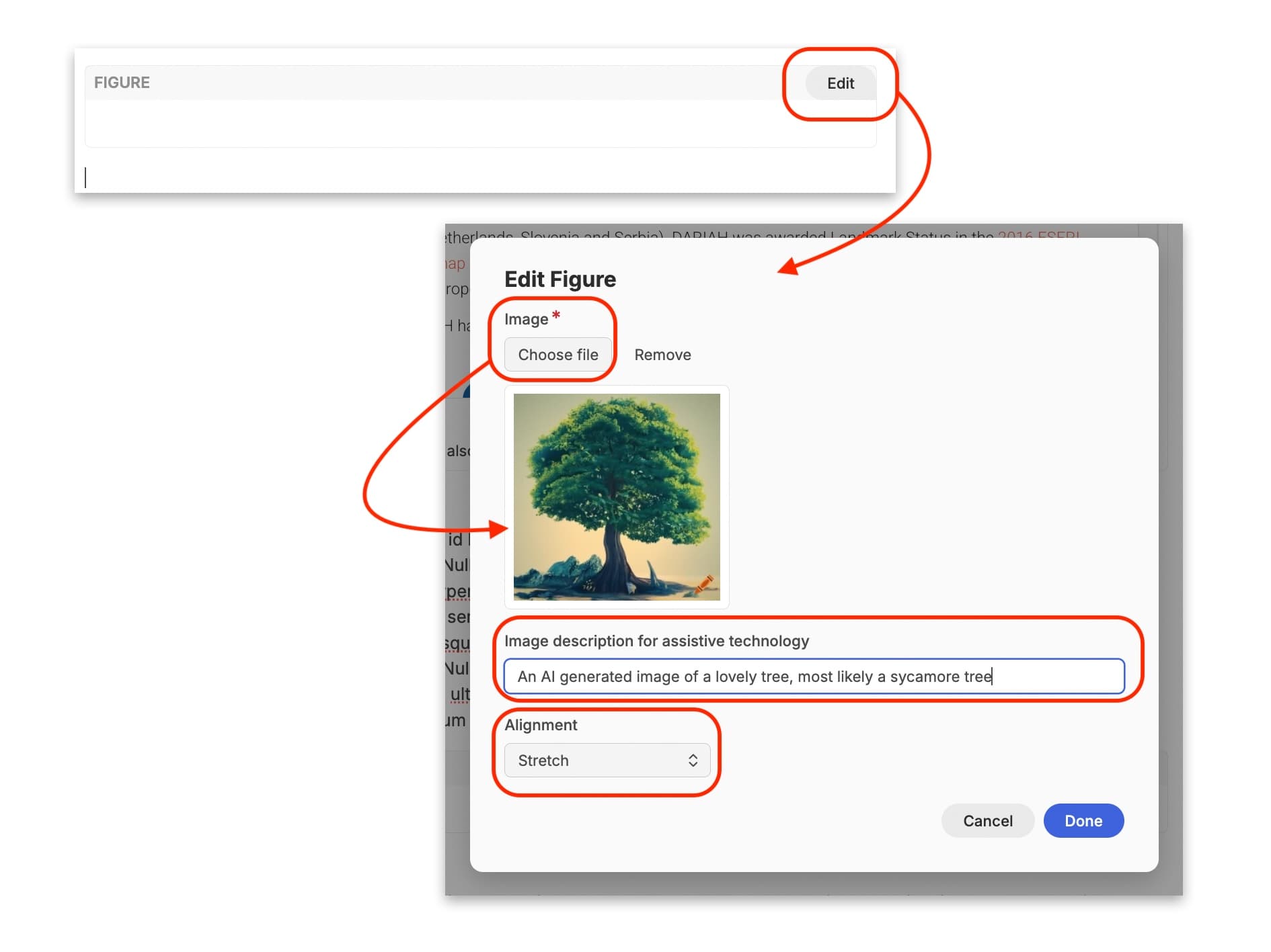 You may want to include images or infographics in your pathfinder resource. This is also very straightforward. When you select the ‘Figure’ widget, a blank box appears on the page with an ‘edit’ button in the top-right hand corner. Click on this and it will open a pop-up window. You first click on the ‘Choose file’ button to open your computer’s file manager to find an image to add. A thumbnail of the image will be displayed below.