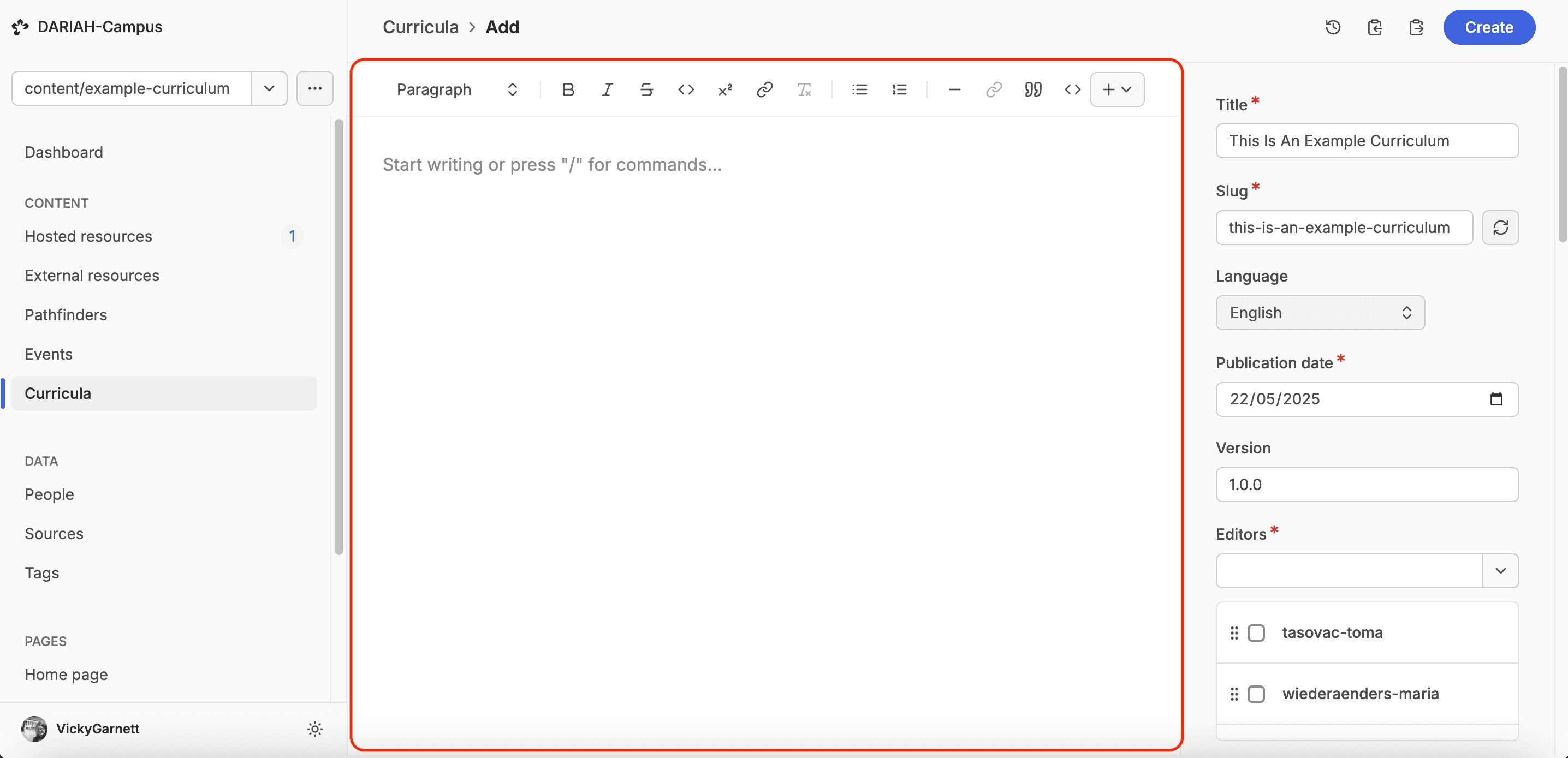 This completes all the metadata fields for a Curriculum, and at this point you can now ‘Create’ your initial draft by clicking on the blue button in the top right-hand corner of the screen. This will save all the metadata. Once you have created the draft, the blue button will change to say ‘Save’. We recommend that you save your work frequently to avoid any loss of content.