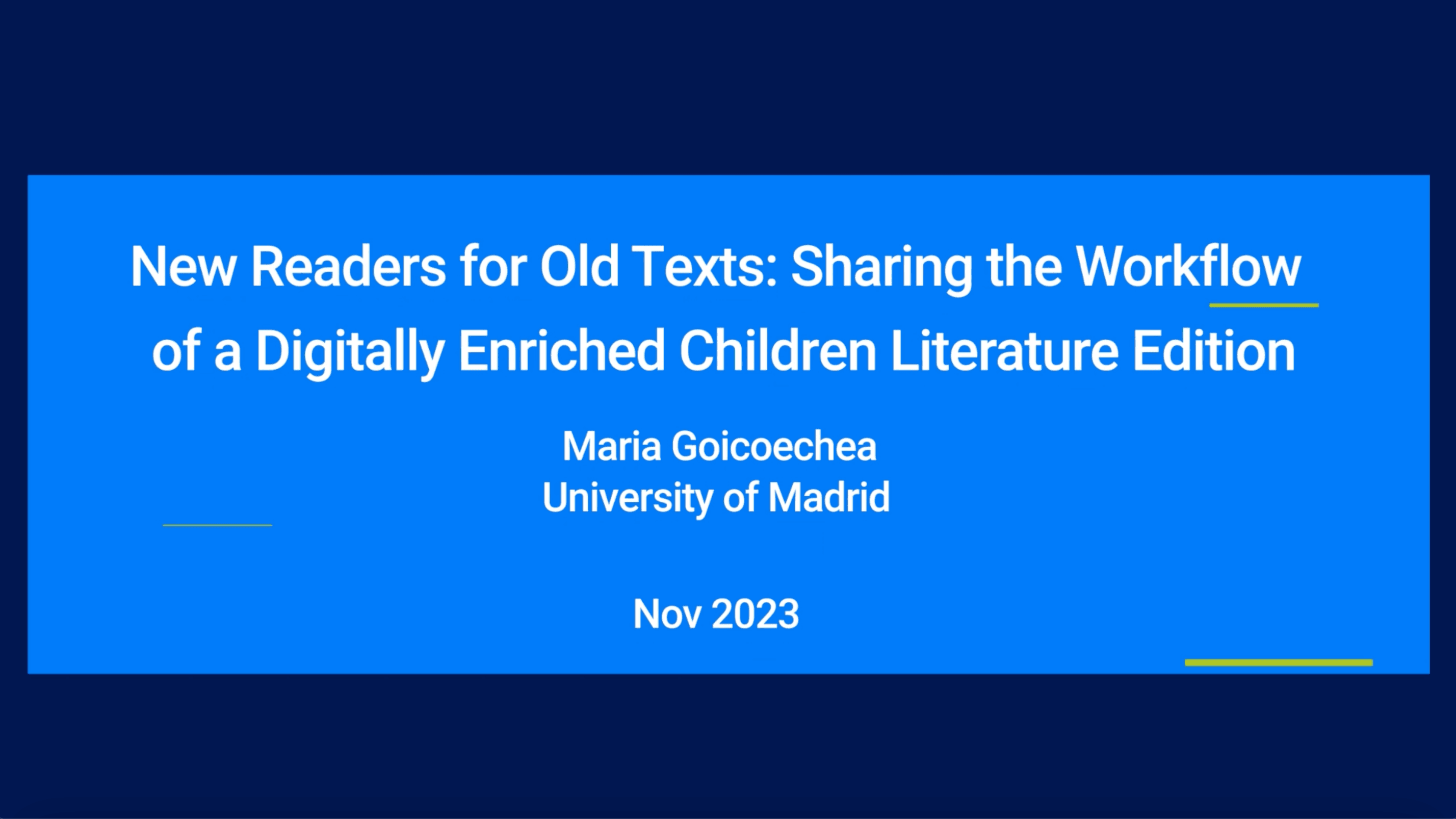 Libraries worldwide are investing a significant portion of their resources in digitising their collections. Digitised formats are immensely valuable for researchers but may seem dry and unappealing to broader audiences, particularly when the original content was intended for children. This talk presents the preliminary research conducted on digitised formats of popular children’s literature found in specialised libraries, focussing on the models provided by two institutions: the British Library’s “Turning the Pages” software and the National Library of Spain’s “Madgazine,” used in the interactive editions of Don Quixote and Leonardo da Vinci’s Madrid Codex. The discussion revolves around the specific workflow we tested for creating a digitally enhanced edition of a collection of stories entitled “Plage of Dragons,” published in 1923 and based on the Spanish adaptations of Edith Nesbit’s tales.