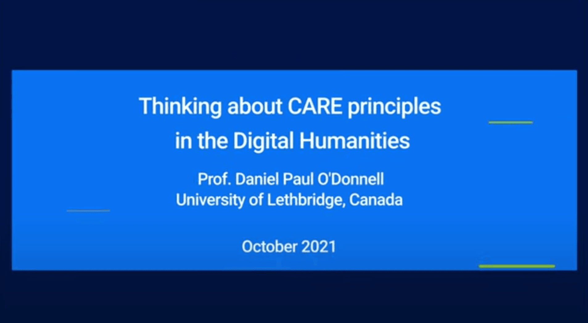 Prof. Dan O’Donnell (University of Lethbridge) discusses the CARE principles, how they sit alongside the FAIR Principles, and how (digital) humanists can apply them in their research. He presents examples from his own research, particularly around studies of historical artefacts in small rural communities in Scotland.